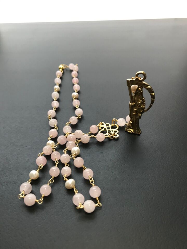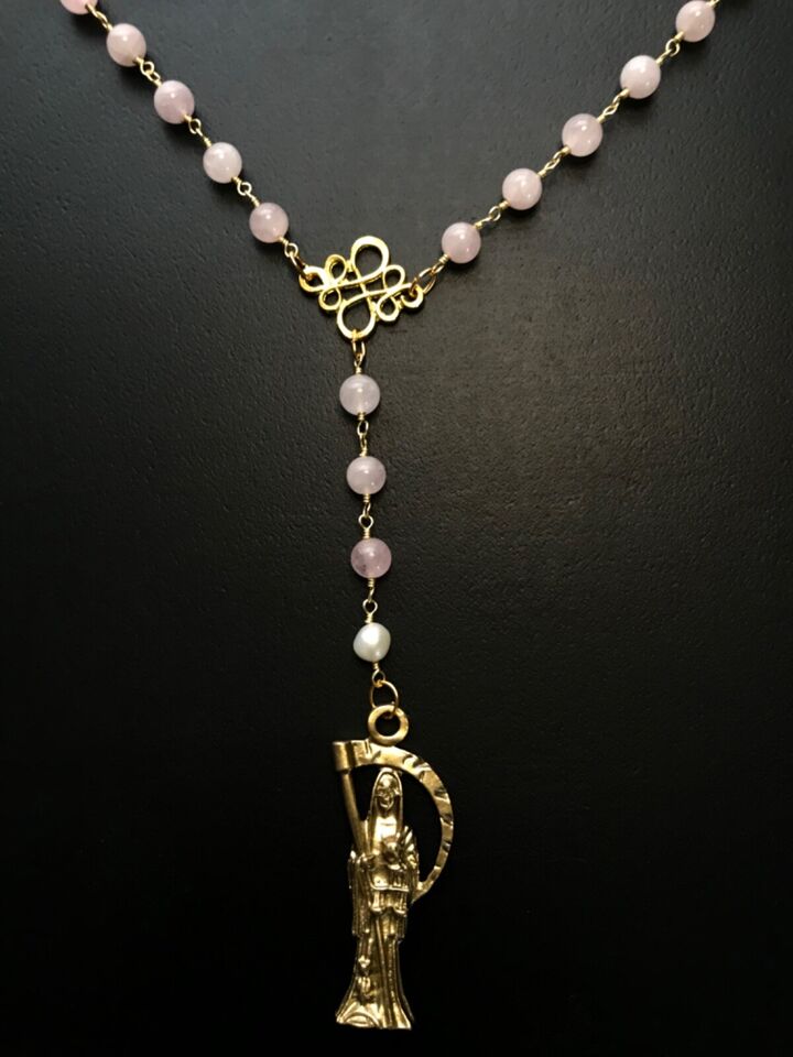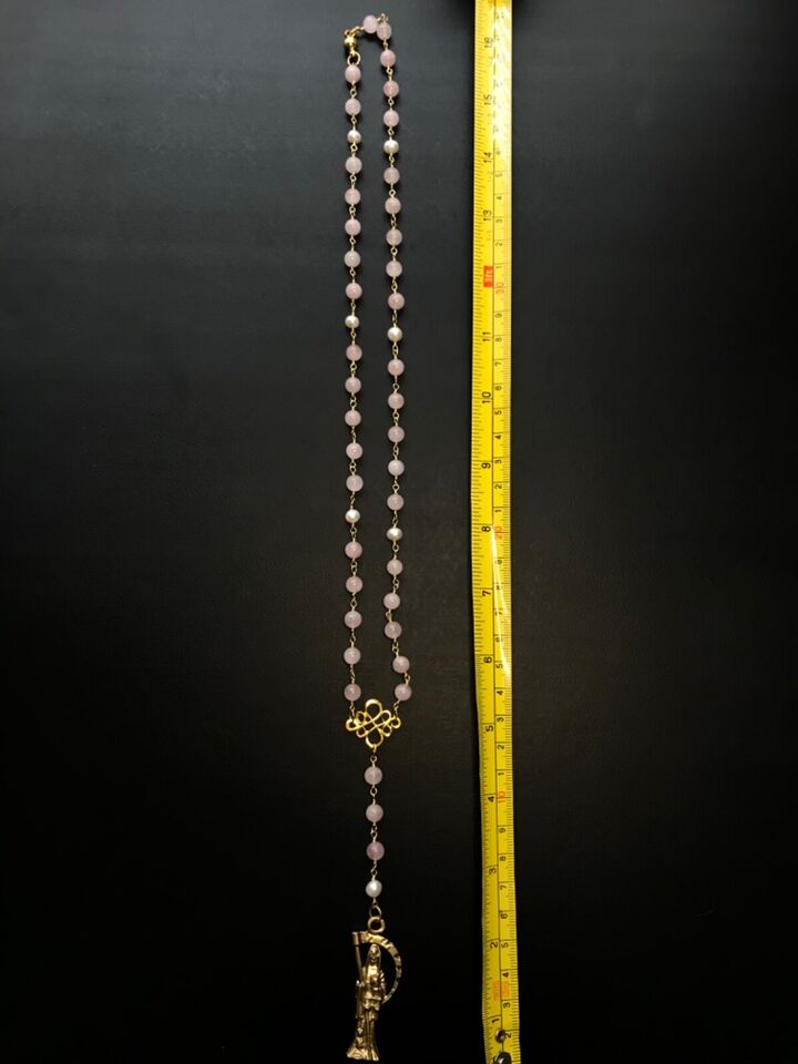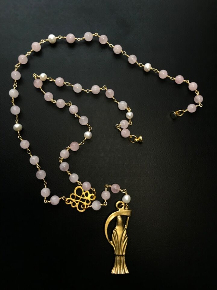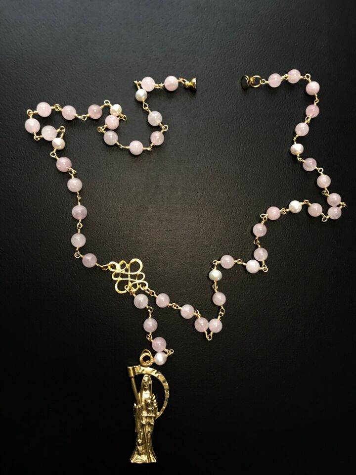 Santa Muerte Rosary / GOLD / Genuine Madagascar PINK ROSE QUARTZ / freshwater pearls / Magnetic closure /Handmade/ FREE SHIP