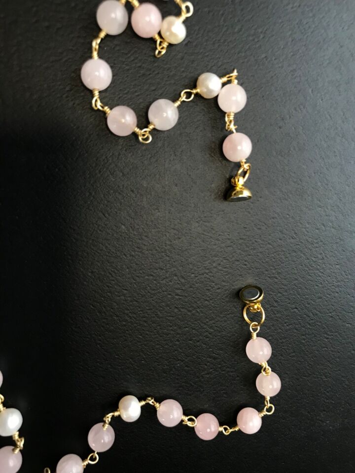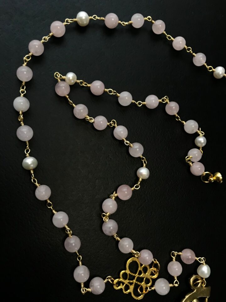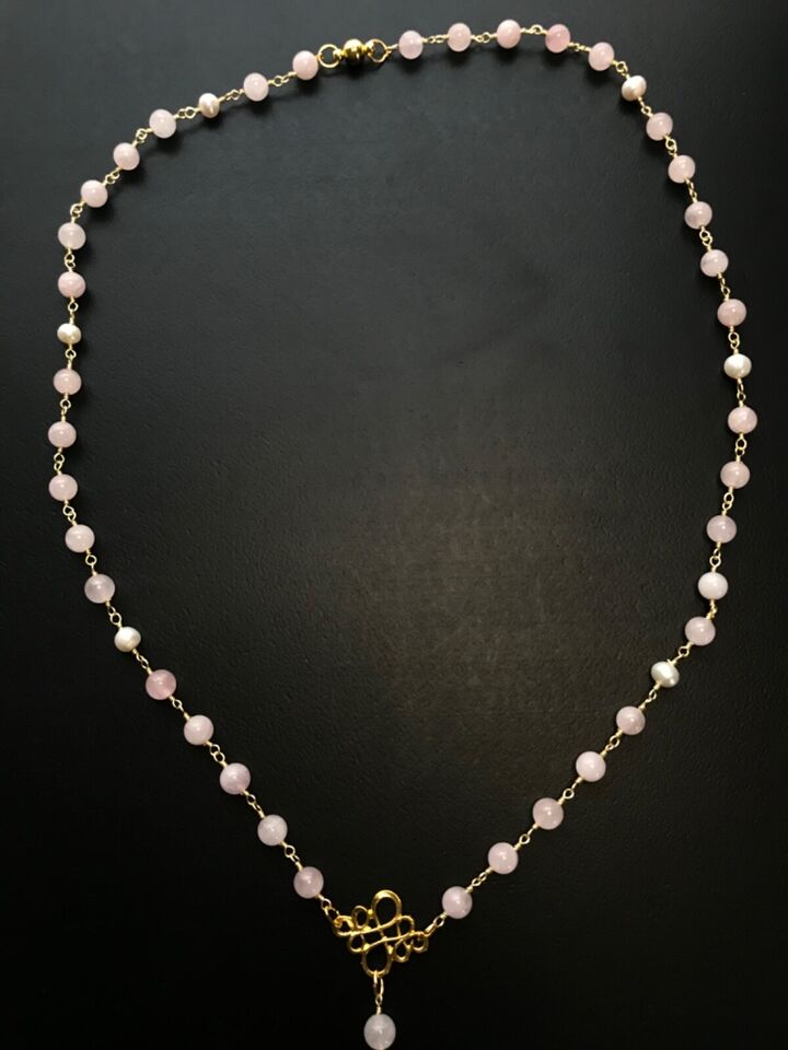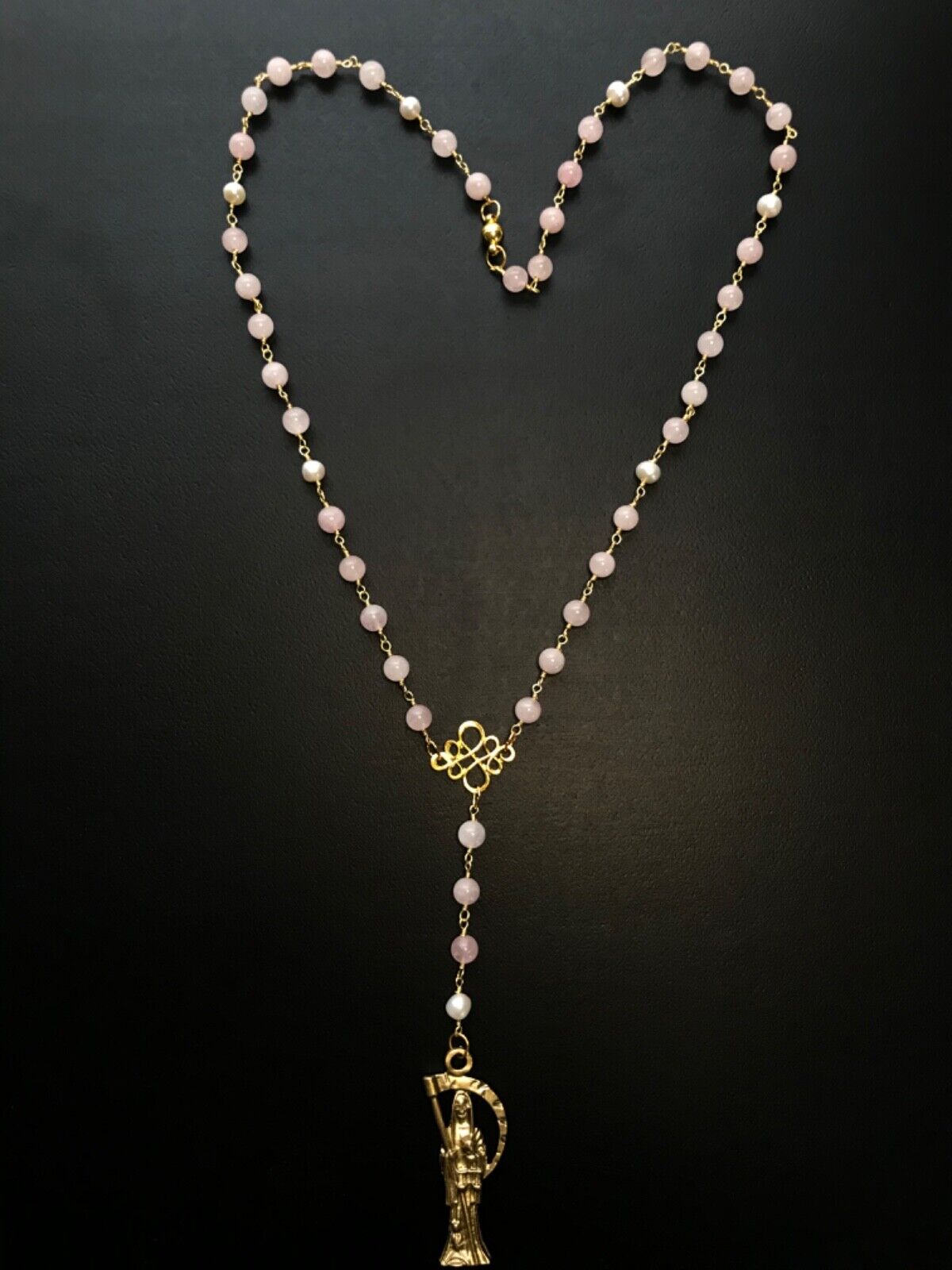 Santa Muerte Rosary / GOLD / Genuine Madagascar PINK ROSE QUARTZ / freshwater pearls / Magnetic closure /Handmade/ FREE SHIP